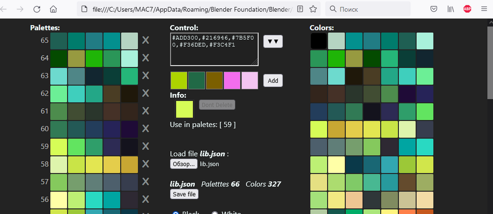 Library (file lib.json)has 65 color palettes